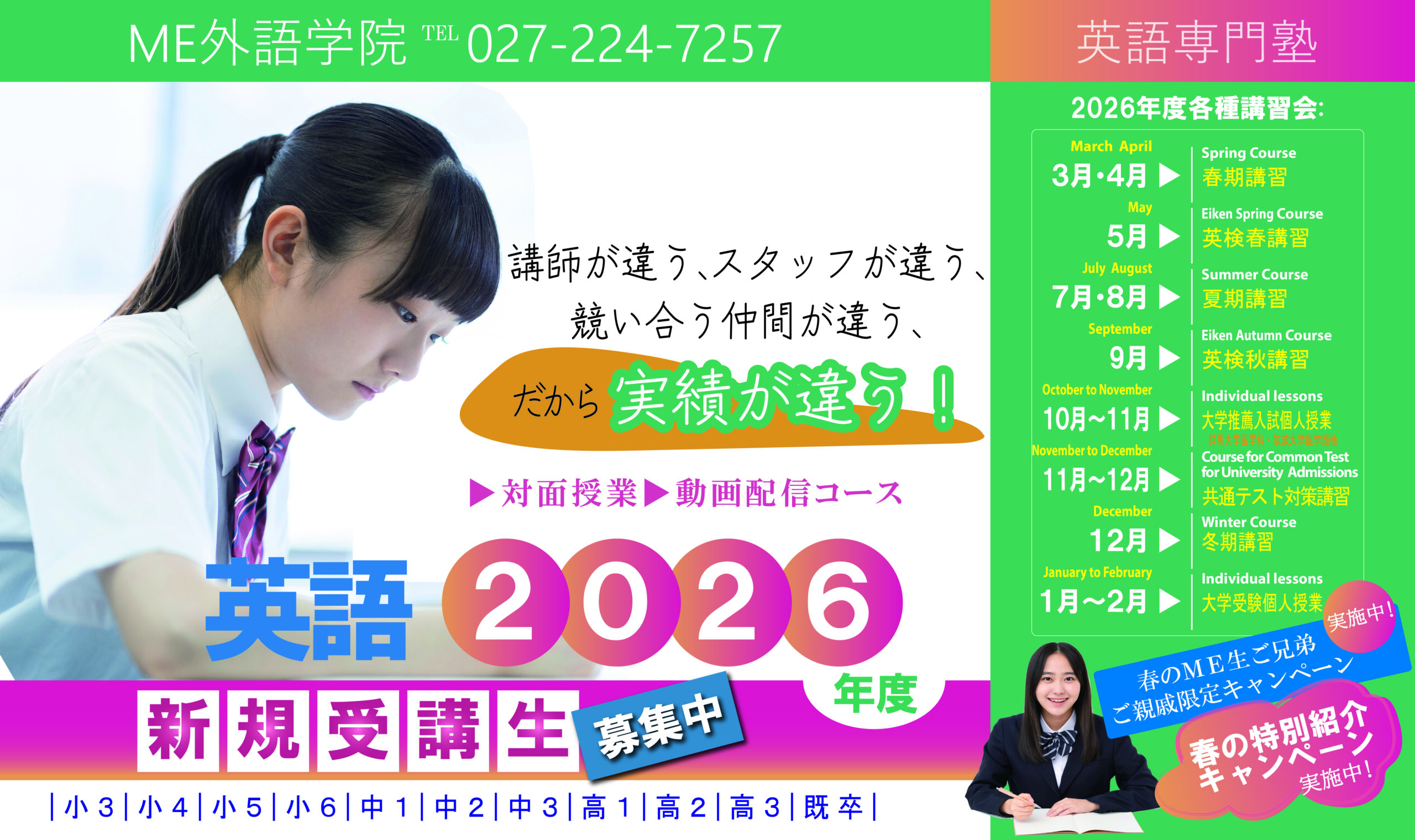 MEでは、春期・夏期・冬期講習会の他に英検講習会・共通テスト講習会を実施しています。集中授業で英語力UPを保証します。