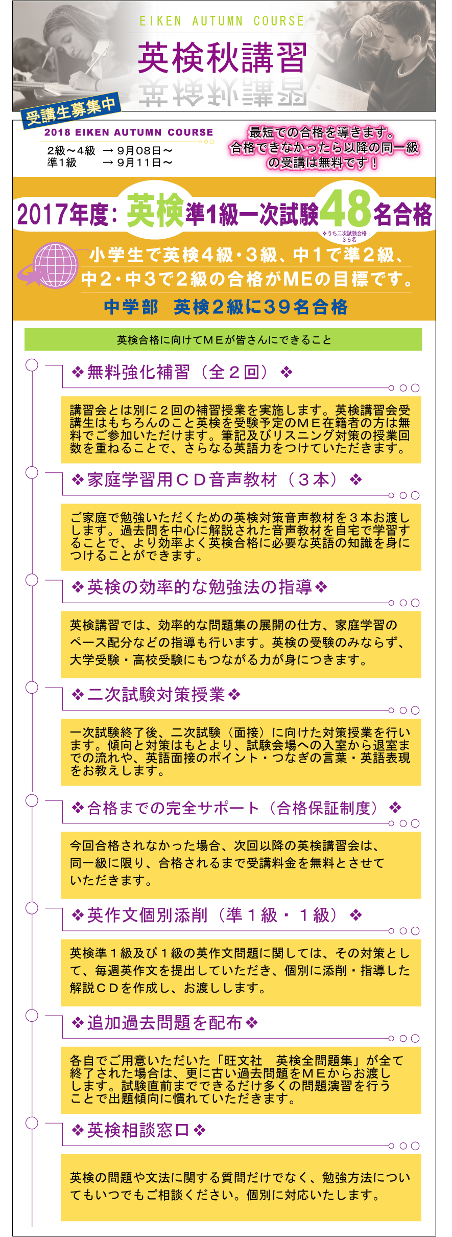 10月7日(日)に、本年度第2回英語検定が実施されます。MEでは、毎年恒例の英検講習を行います。毎回多くの生徒さんが、この講習で成果を上げ合格を果しています。在籍者の方はもちろんのこと、皆様のご兄弟、ご親戚、お知り合いの方で英検受験に興味のある方がいらっしゃいましたら、是非ともご参加ください。