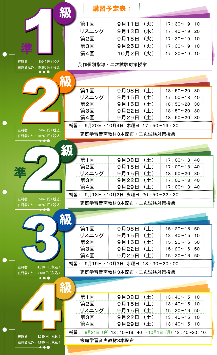 英検講習申込締切日は9月7日(金)とさせていただきますが、募集定員に限りがありますので、お早めにお電話にてお申し込みください。