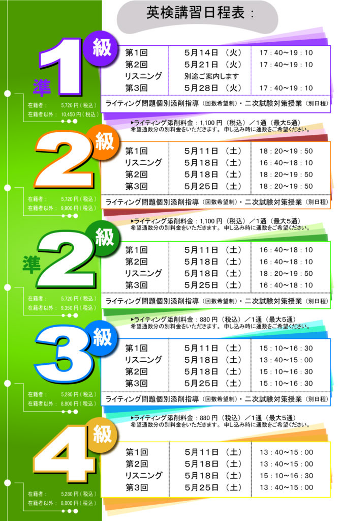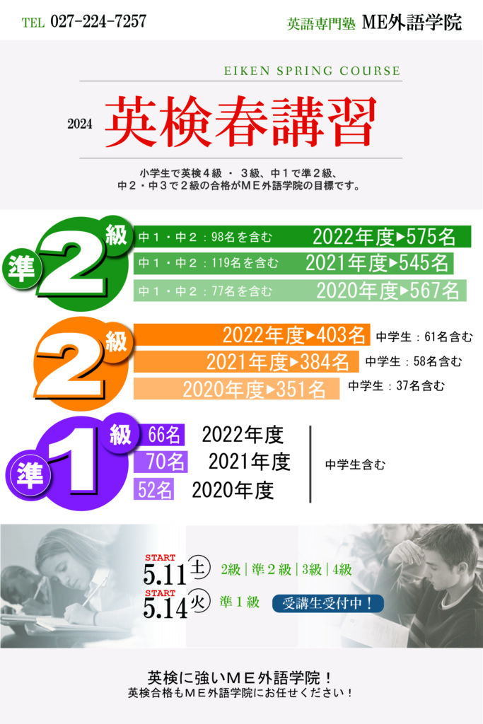 お問い合わせ :英検講習内容・お申し込み方法・他についてご不明な点がございましたらお電話にてお問い合わせください。 ℡027-224-7257(受付時間 14:00-21:30)。