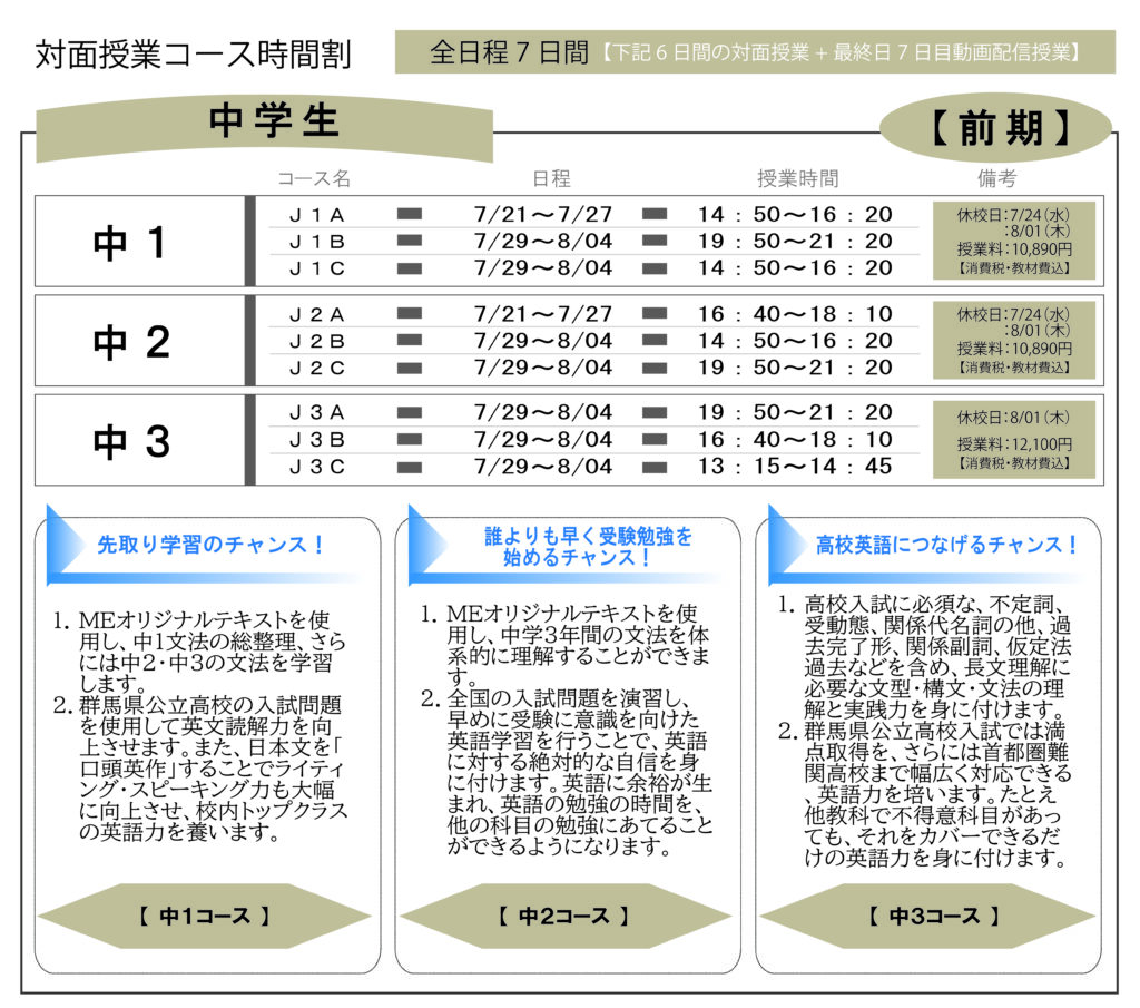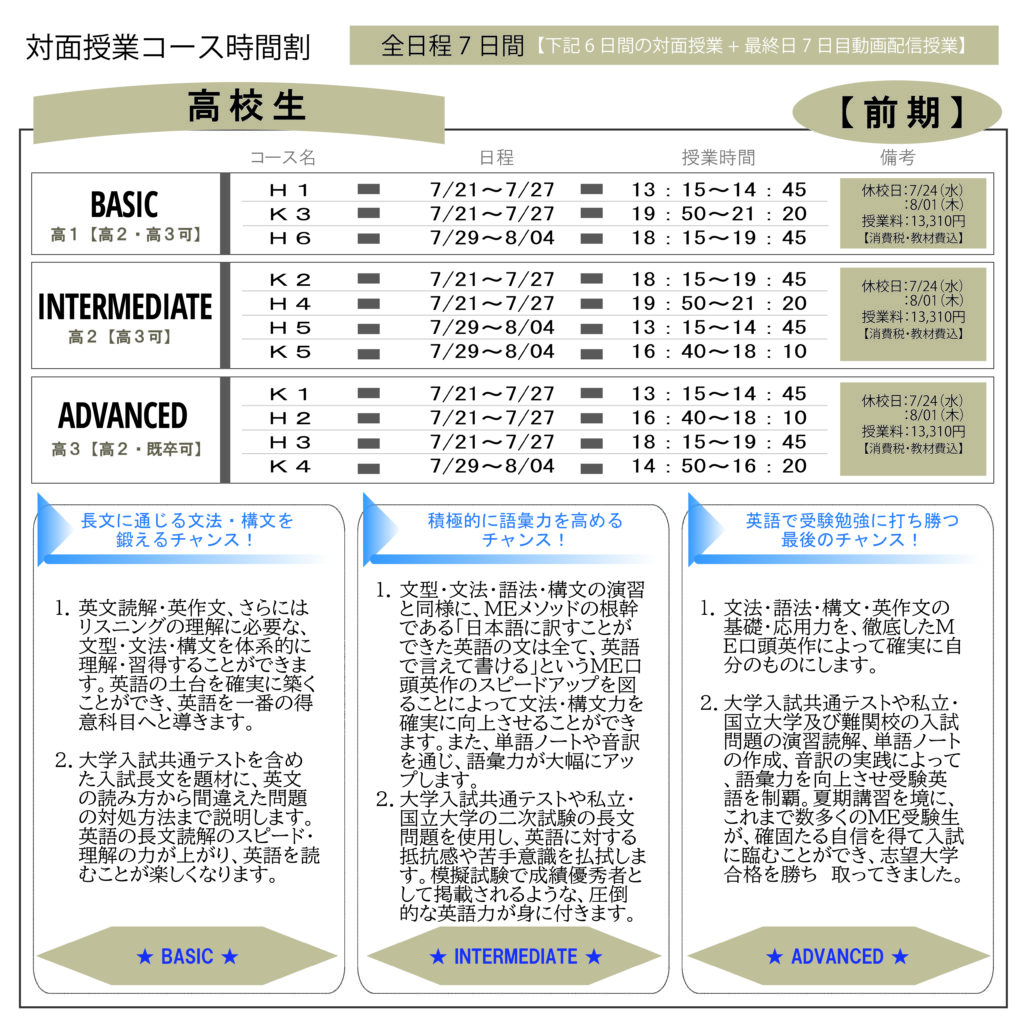 MEの授業は、真剣勝負です。一分一秒たりとも、皆さんの時間を無駄にさせません。冬期、春期、夏期の季節毎の講習は、短期間で集中的に勉強することが出来、英語力を飛躍的に向上させることが出来る、またとない大きなチャンスです。ぜひこのチャンスをつかんで、英語の人生をドラスティックに変える夏にしましょう。