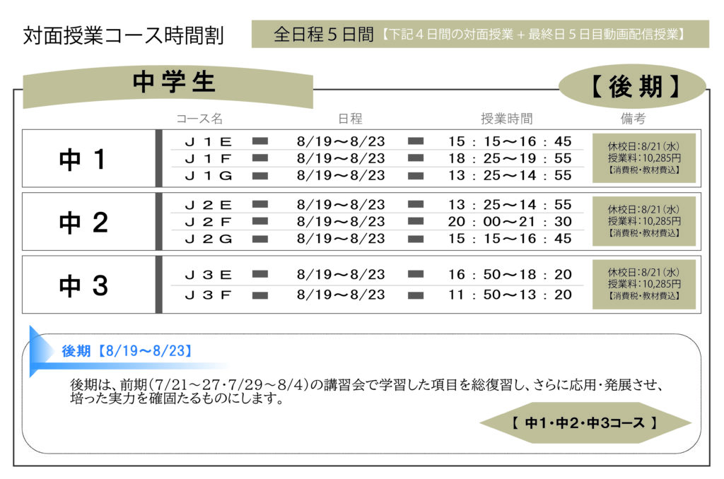 - 中3生・高校生・高校既卒生の【夏期講習前期】での複数受講の場合は、2コース目を半額とさせていただきます。