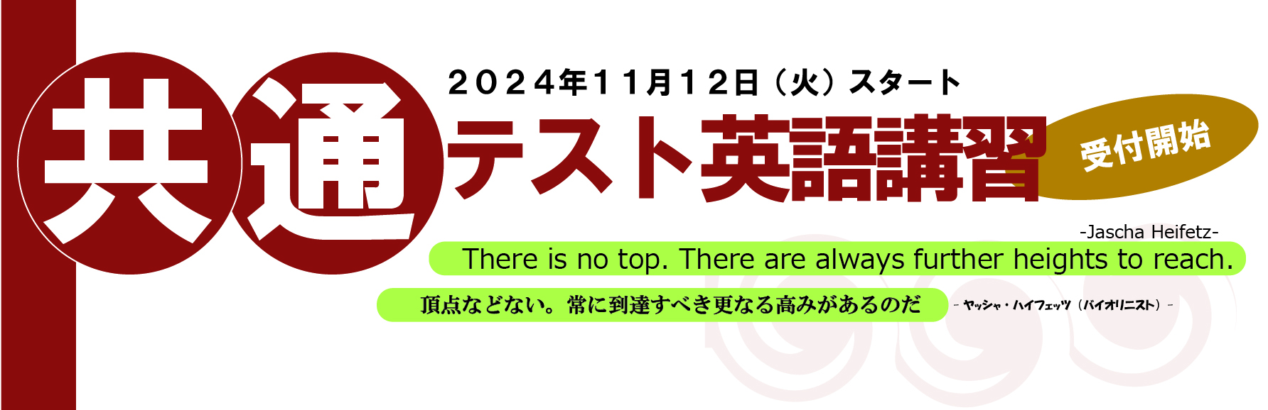 今年度の共通テスト講習においても、この4年間で培ったノウハウにさらに磨きをかけ、本番で1点でも多く得点していただくために、一生懸命指導させていただきます。みなさんにとって、共通テストとは、志望校合格という目標を達成するための通過点に過ぎないかもしれません。しかし、合格を達成するためには、必ず通過しなければならない、本当に大切な試験です。今回の講習でしっかりと勉強していただければ、来たる共通テストにおいて、必ずや、満点・高得点を取れるものと確信しています。ぜひ、英語を一番の武器として入試を戦い、志望大学合格を勝ち取って、みなさんの夢を実現してください。
