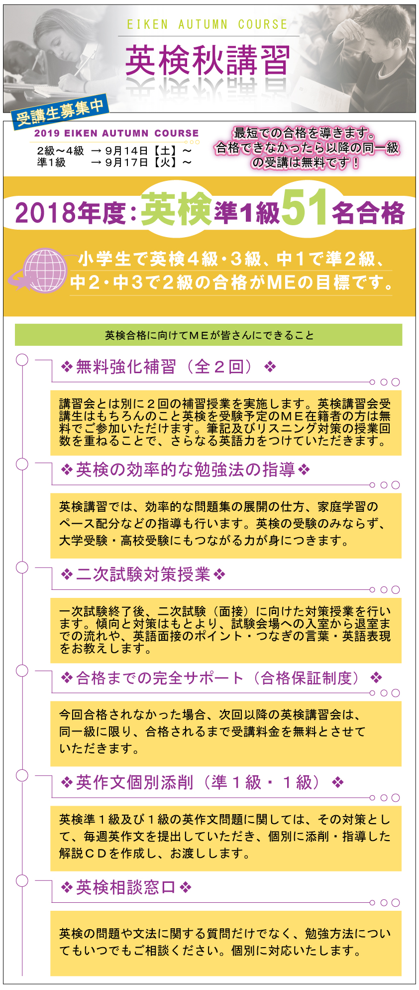 10月6日(日)に、本年度第2回英語検定が実施されます。MEでは、毎年恒例の英検講習を行います。毎回多くの生徒さんが、この講習で成果を上げ合格を果しています。在籍者の方はもちろんのこと、皆様のご兄弟、ご親戚、お知り合いの方で英検受験に興味のある方がいらっしゃいましたら、是非ともご参加ください。