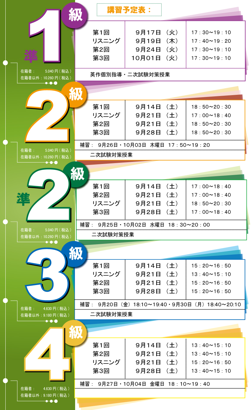 ◆ 英語検定試験の申込は当学院では行っておりません。学校または書店にて、各自お申し込みください。 (英語検定の書店申込締切日は9月6日・英検HP申込締切日は9月12日です)