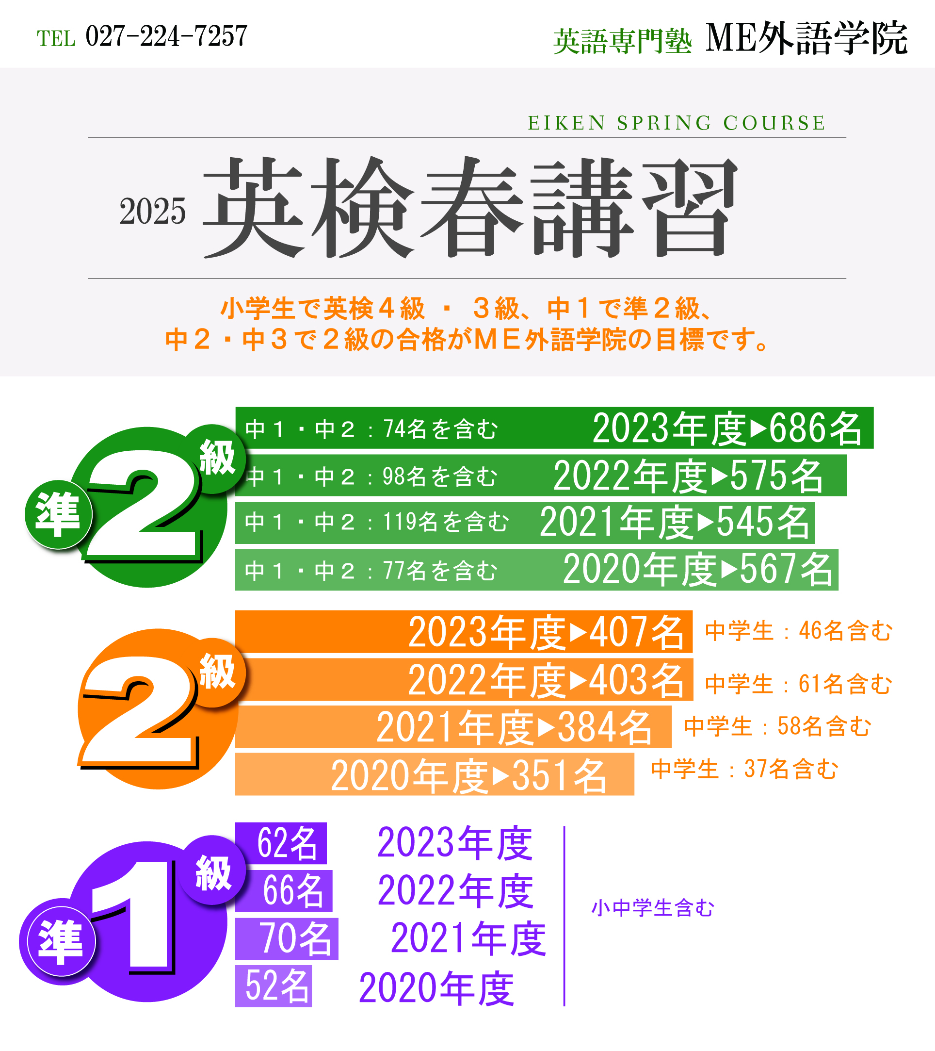 お問い合わせ :英検講習内容・お申し込み方法・他についてご不明な点がございましたらお電話にてお問い合わせください。 ℡027-224-7257(受付時間 14:00-21:30)。
