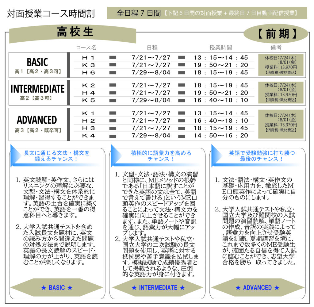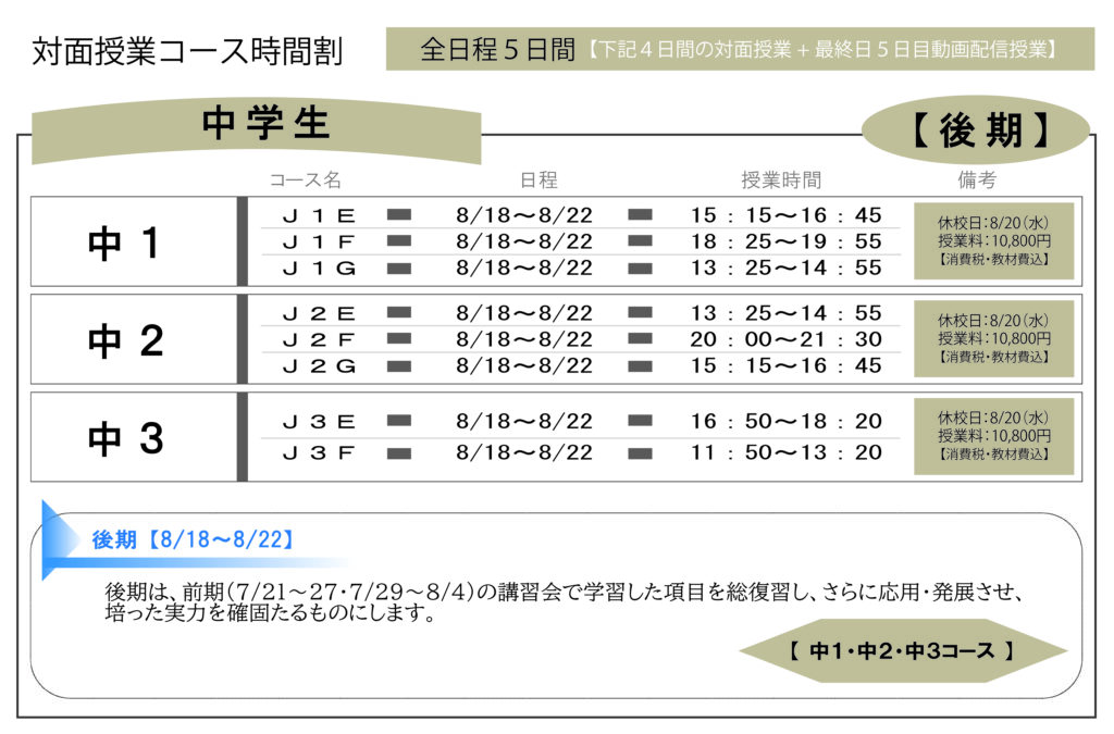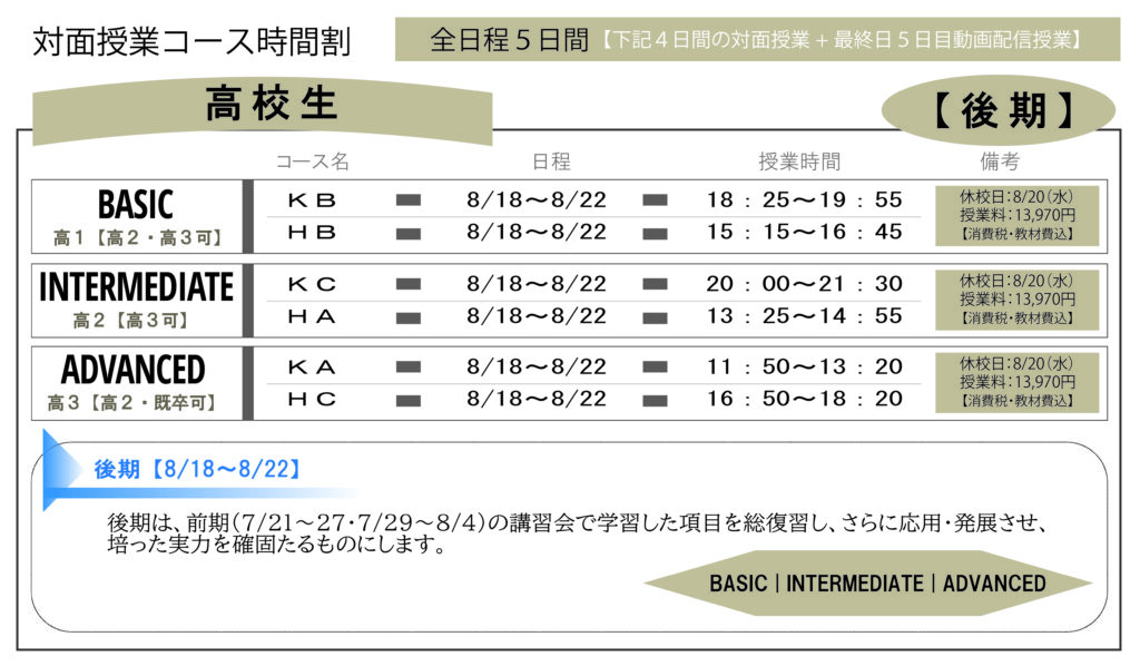 - 中3生・高校生・高校既卒生の【夏期講習前期】での複数受講の場合は、2コース目を教材費【3,300円】のみで受講できます。