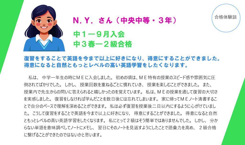 MEでは創設以来、多くの生徒さんが英検講習を受講し、英検合格を勝ち取ってきました。2025年度分は現在集計中ですが、2024年度には、準1級に68名、2級に419名(中学生47名を含む)、準2級に672名(中1・中2の64名を含む)の生徒さんが、合格をしています。毎年、英語専門塾として誇りをもてる確かな合格実績を積み重ねています。