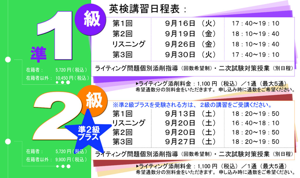 お問い合わせ :英検講習内容・お申し込み方法・他についてご不明な点がございましたらお電話にてお問い合わせください。 ℡027-224-7257(受付時間 14:00-21:30)。