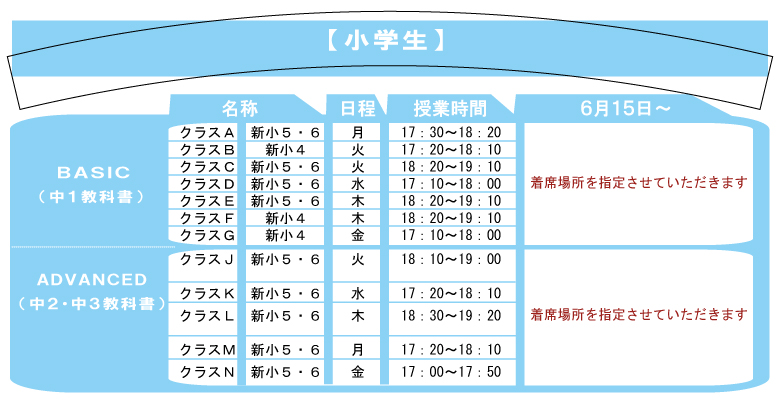※大学受験Advanced火曜クラス、中学1年水曜クラス、大学受験Intermediate木曜クラス、中学1年金曜クラスにつきましては、6月1日~6月12日と同じく、クラスを分割して、2つの異なった時間帯で行いますので、同じ時間帯の授業にご参加ください。