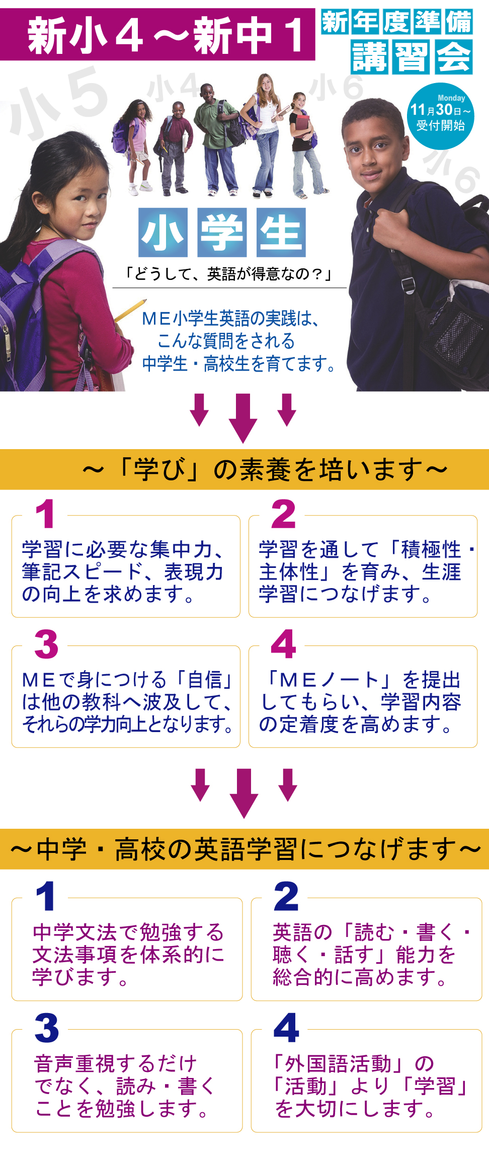 ぜひご一読いただき、当学院の英語教育の一端をご理解いただければと思います。小学生が、わずか1年で大きく成長する様子。小学クラスで身につけた勉学の習慣が、中学・高校での学びの基礎となって、ライバルを圧倒するような学力を身につけられること。どんな高い目標でも、怯まずに挑み、達成できること。そういったMEの伝統を感じていただければ幸いです・・・
