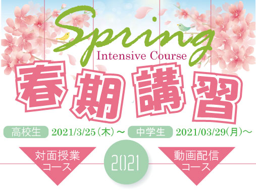 さて、来たる3月25日(木)から新高2・3生を対象とした春期講習対面コースが、3月25日(木)および3月29日(月)から新高1生を対象とした春期講習対面コースが、3月29日(月)からは中学生を対象とした春期講習対面コースが実施されます。中高生を対象とした春期講習動画コースも受け付けております。また、4月8日(木)から順次、小学生・中学生・高校生を対象として、1学期通常授業が始まります。